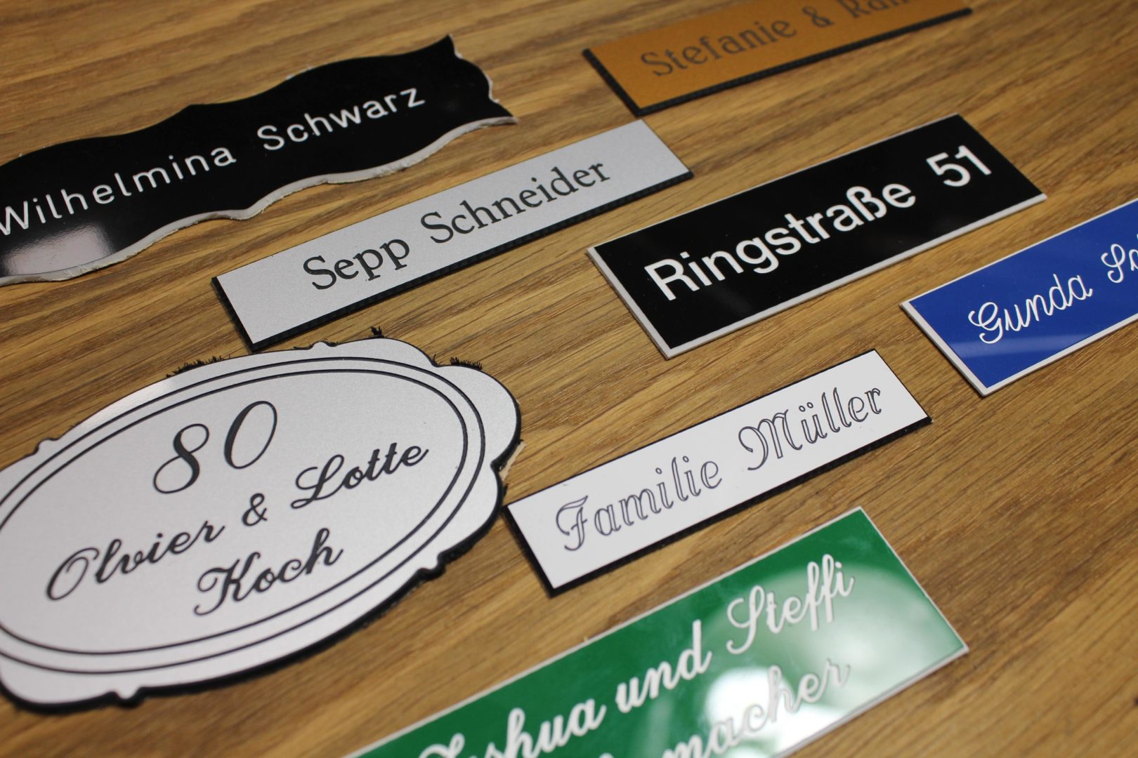 Mijnnaamplaat is gespecialiseerd in maatwerk. Door de eigen fabriek en het rechtstreeks contact met de klant kunnen we alles maken. Neemt u contact met ons op voor speciale wensen dan heeft u rechtstreeks contact met de graveerders van Mijnnaamplaat. Ze bezitten de kennis over de producten en bewerkingsmethoden en kunnen u dus het beste uitleggen wat er mogelijk is en wat het beste resultaat zal hebben.